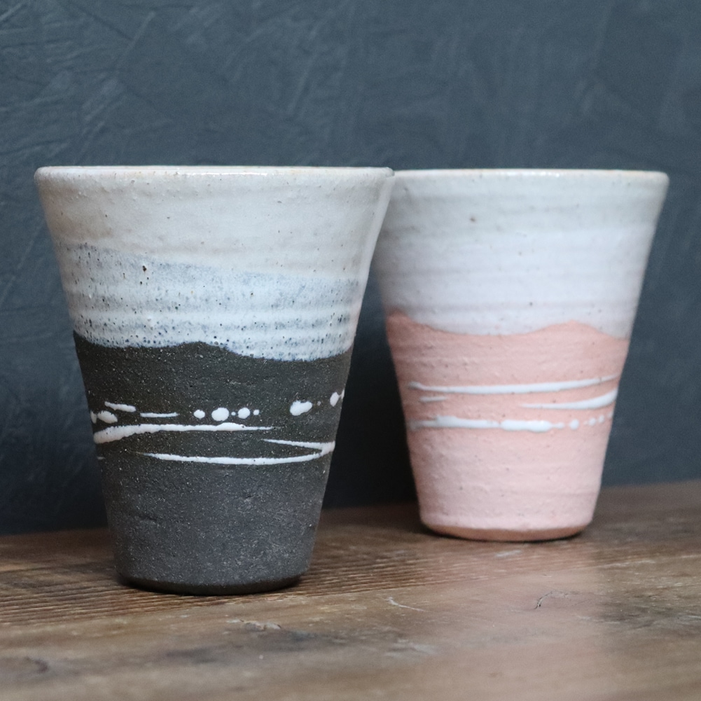 うつわ > フリーカップ > 信楽焼 ペア フリーカップ 保温 2客セット 陶器 結婚祝い 食器 ペアカップ おしゃれ かわいい 和食器 タンブラー 日本製 コップ 焼き物 器 潮騒(ブラック・ピンク)フリーカップペアセット w501-05-06