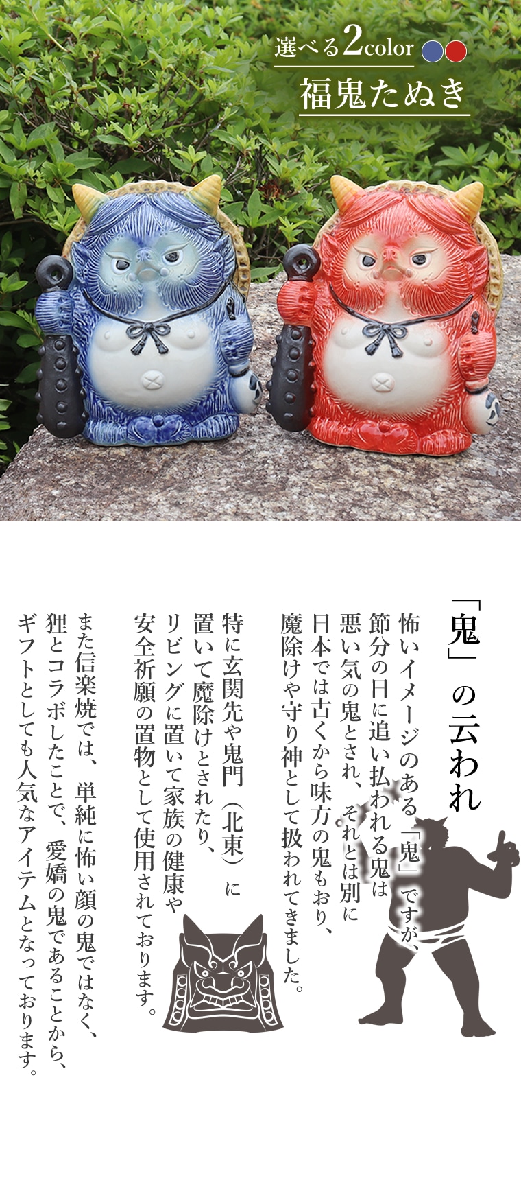 たぬき > 信楽焼 たぬき 鬼 置物 可愛い鬼 狸 タヌキ 赤鬼 青鬼 玄関先 鬼門 置き物 プレゼント 贈り物 おしゃれ 陶器 選べる2色 福鬼たぬき ta-0445