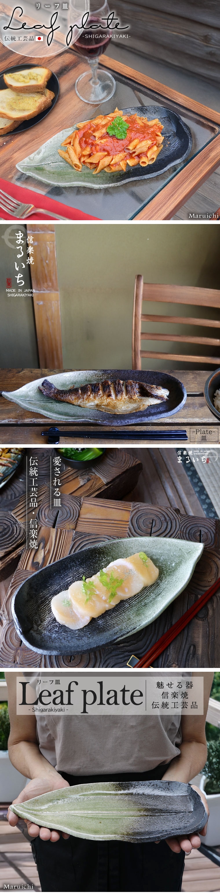 信楽焼 サンマ皿 30.5cm パスタ皿 陶器 焼き魚皿 おしゃれ 和風 ロングプレート 和食器 お皿 葉っぱ型 しずく型 プレート 大皿 長い 結婚祝い ビードロ釉リーフ皿 w399-58